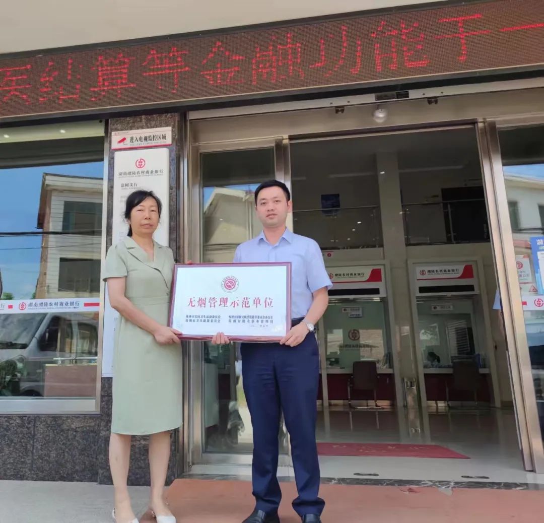 7月2日,株洲市爱国卫生运动委员会、精神文明建设指导委员会办公室、卫生健康委员会、机关事务管理局等联合授予醴陵农商银行嘉树支行“无烟管理示范单位”荣誉称号。醴陵市嘉树镇副镇长兰礼平受托上门授牌并道贺。